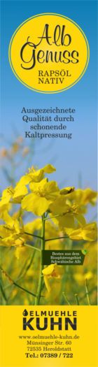 Wir sind eine familiär geführte Ölmühle in Heroldstatt am Rande des Biosphärengebiets Schwäbische Alb. Unser Ziel ist es, unseren Kunden ein hochwertiges Pflanzenöl anzubieten, das geschmacklich und inhaltlich überzeugt. Daher achten wir sehr darauf, dass die zur Verarbeitung kommenden Rapssamen, von bester Qualität sind und nachhaltig erzeugt wurden. Um dies zu gewährleisten, verarbeiten wir Rapssaat vom eigenen landwirtschaftlichen Betrieb sowie aus der Region, welche nach den Vorgaben des kontrolliert integriertem Anbaus produziert wurden.
